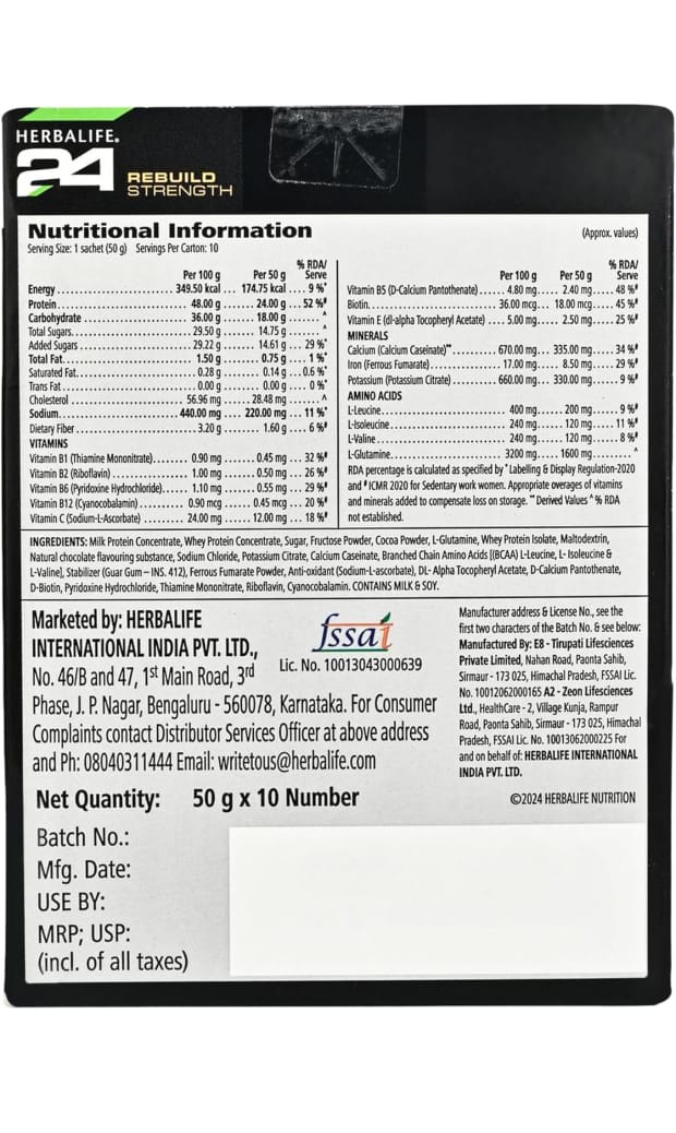 Herbalife Nutrition 24 Rebuild Strength is a scientifically formulated post-workout recovery shake, created to support athletes and active individuals after intense exercise. With a combination of high-quality proteins, carbohydrates, amino acids, vitamins, and minerals, it helps the body recover, rebuild, and restore energy levels after training sessions. The chocolate flavor gives it a rich and smooth taste, making it enjoyable while delivering essential nutrition.